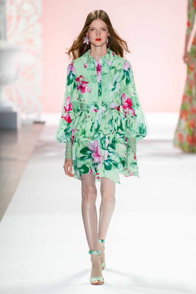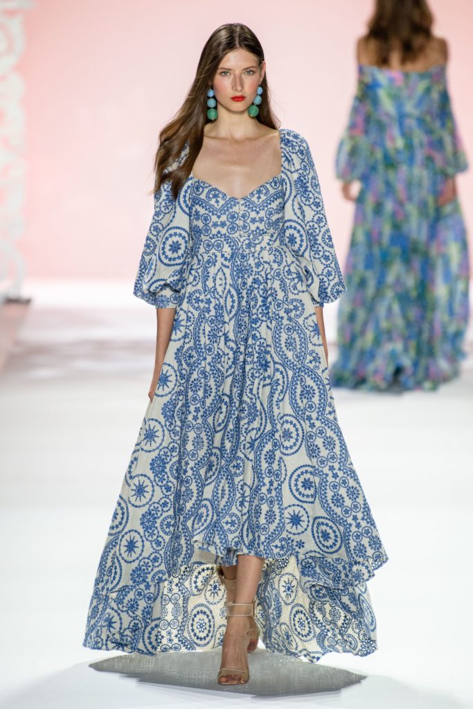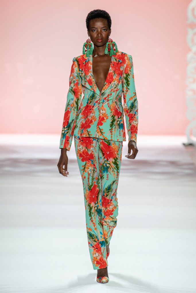 FIRST READ: The design duo served up a solid dose of their trademark red-carpet frocks in floral prints and tropical jewel hues, while flirty swimwear and flowing cover ups added to the collection’s island vibe. Tailored suiting in vibrant shades and statement figure-hugging column gowns covered in sequins and beaded embellishment rounded out the show’s evening offering.
