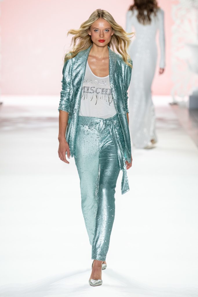 BEST LOOK: A sparkly iridescent suit set in ocean blue, teamed with a white tee with dripping crystal accents and matching pumps. Also key were a series of looks featuring a hibiscus print in seafoam green and magenta: think a one-shouldered dress with a ruffle neckline, a floaty chiffon v-neck gown, and demure mini dress teamed with matching pumps with a ladylike ankle strap.
